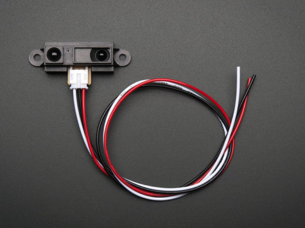 To use, connect black wire to ground, red wire to 5V and white wire to analog input. The analog voltage out will range from 3V when an object is only 4″ (10 cm) away and 0.4V when the object is 32″ (80 cm) away